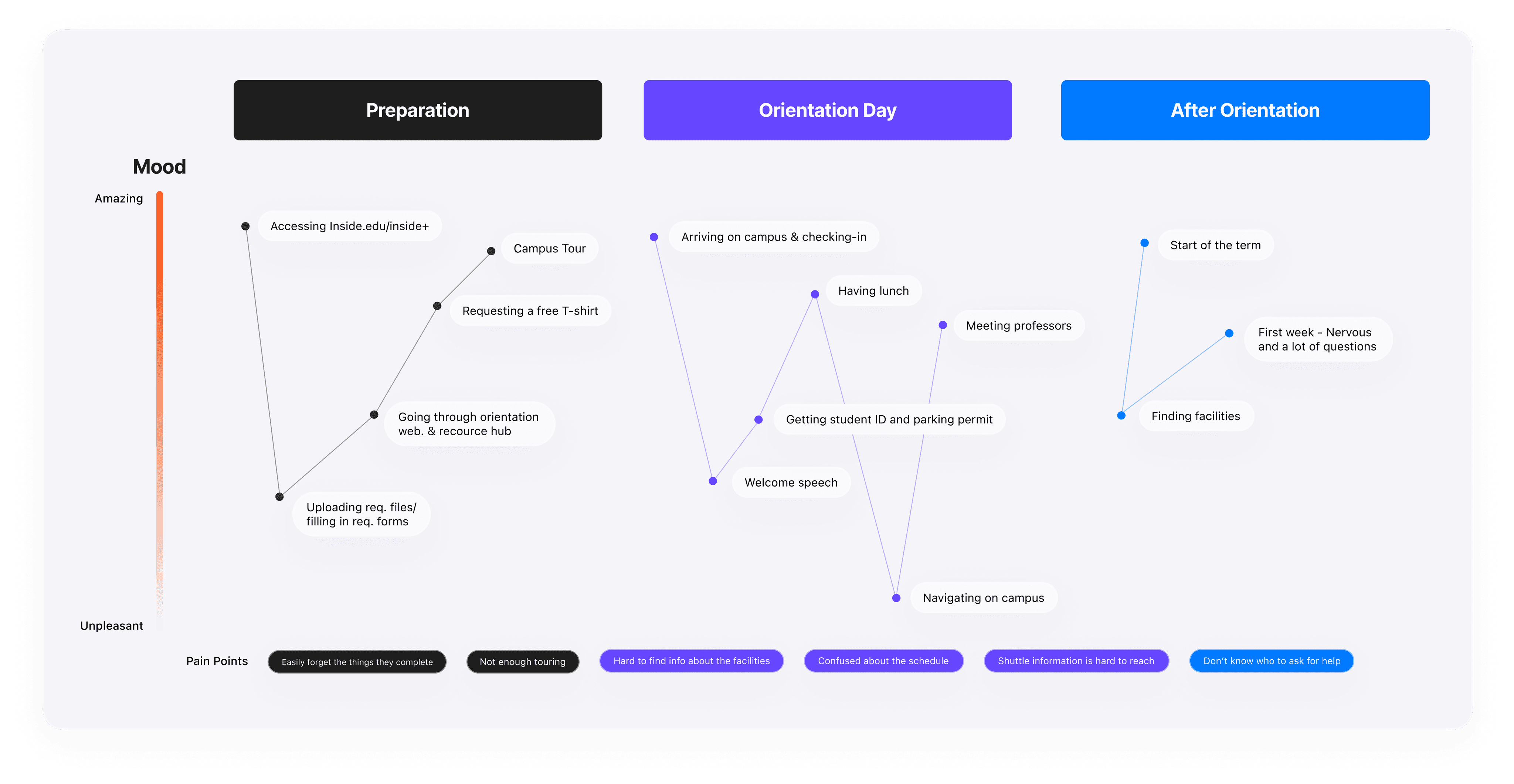 Our journey map covers Preparation, Live Session, and Orientation Day, showing students' actions, goals, feelings, and identifying key pain points and opportunities in each stage.